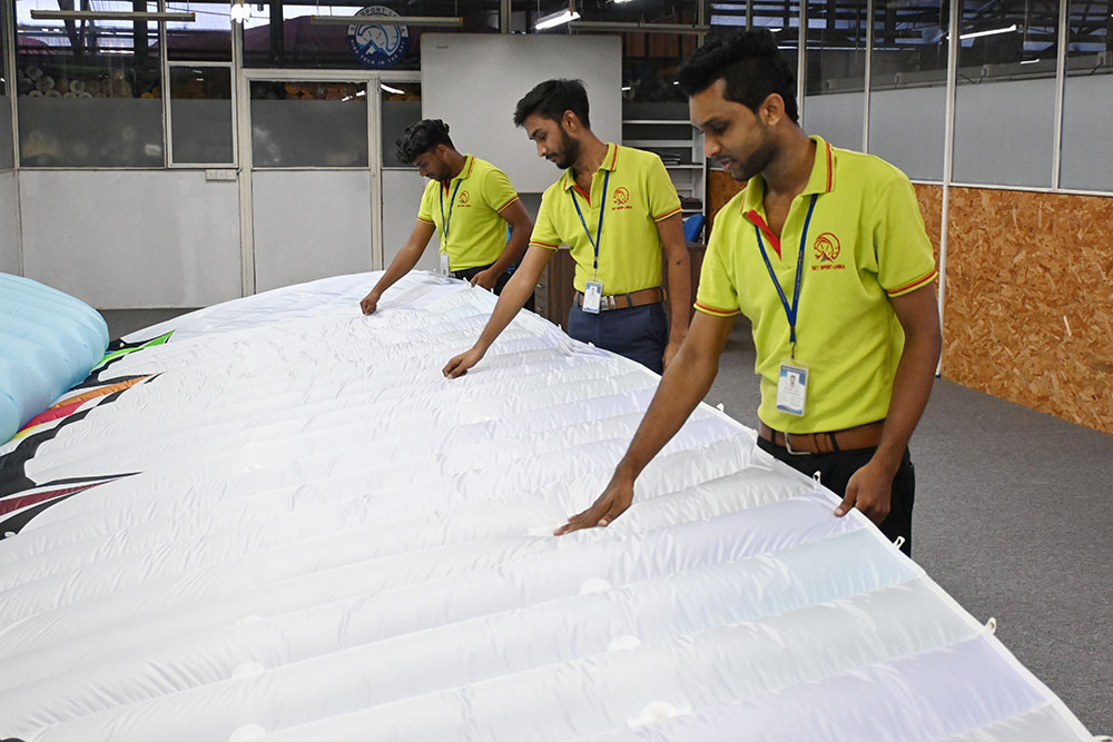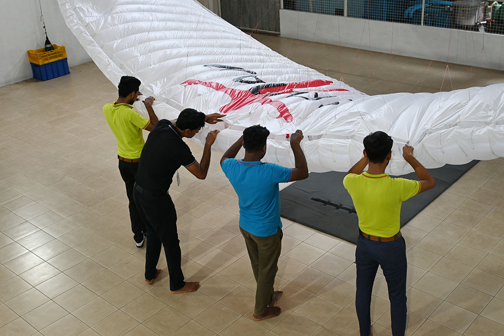 • Wind Blow Method: We use the wind blow method to thoroughly check paragliders and rescue parachutes.